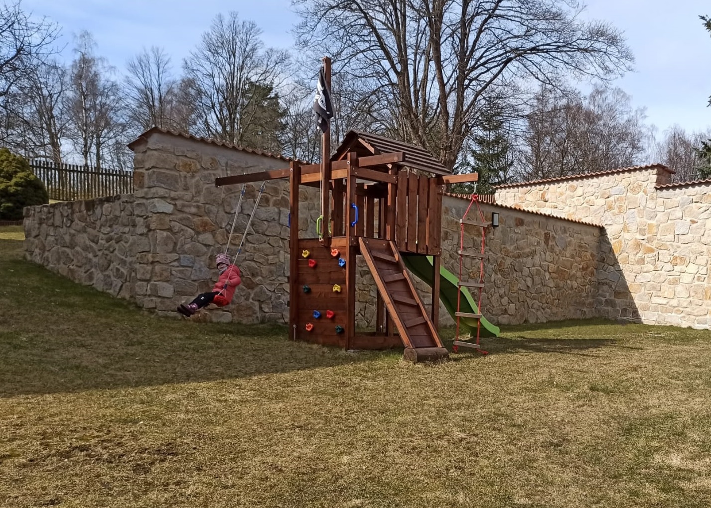 Naše menší dětské hřiště je zábavným místem pro děti, kde si mohou hrát a vybít energii.